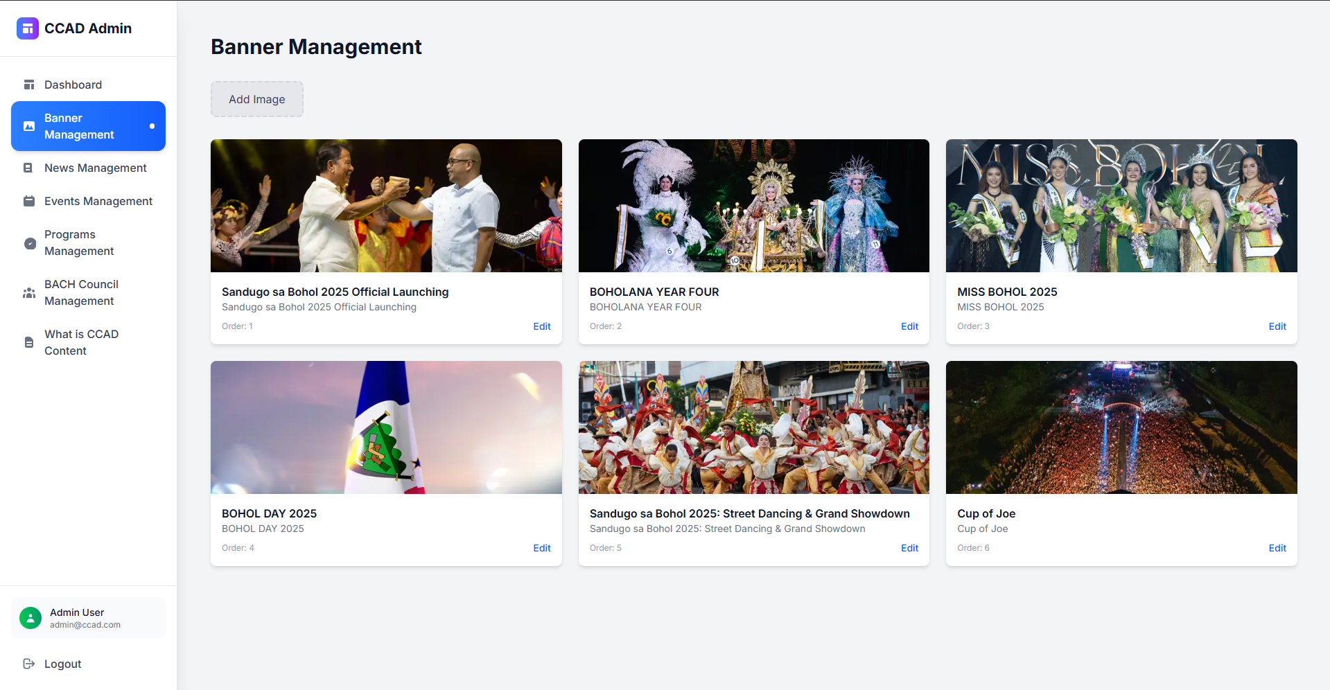 Description: A dynamic content management system for the Center for Culture and Arts Development – Bohol (CCAD), built during my internship.