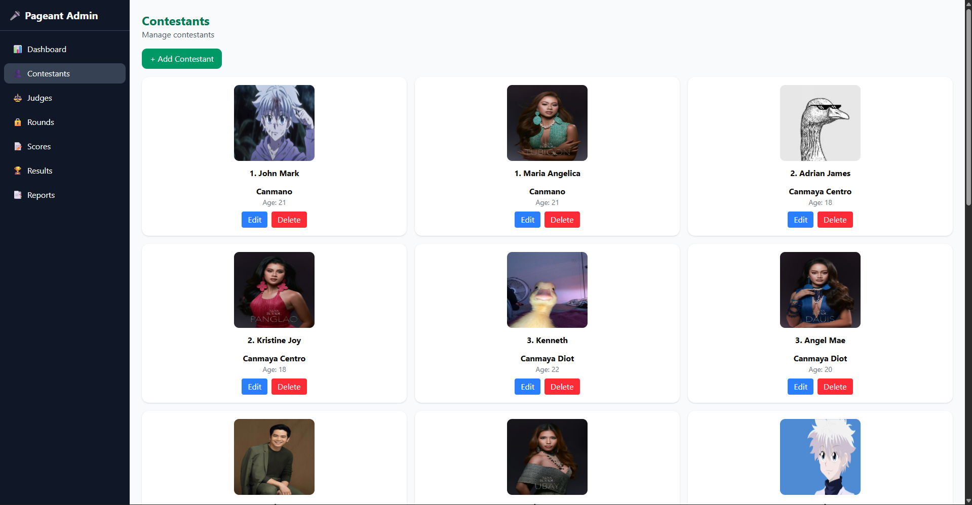 • Contestant Management — create / edit / delete contestants, upload photo (Cloudinary), set contestant number and metadata.