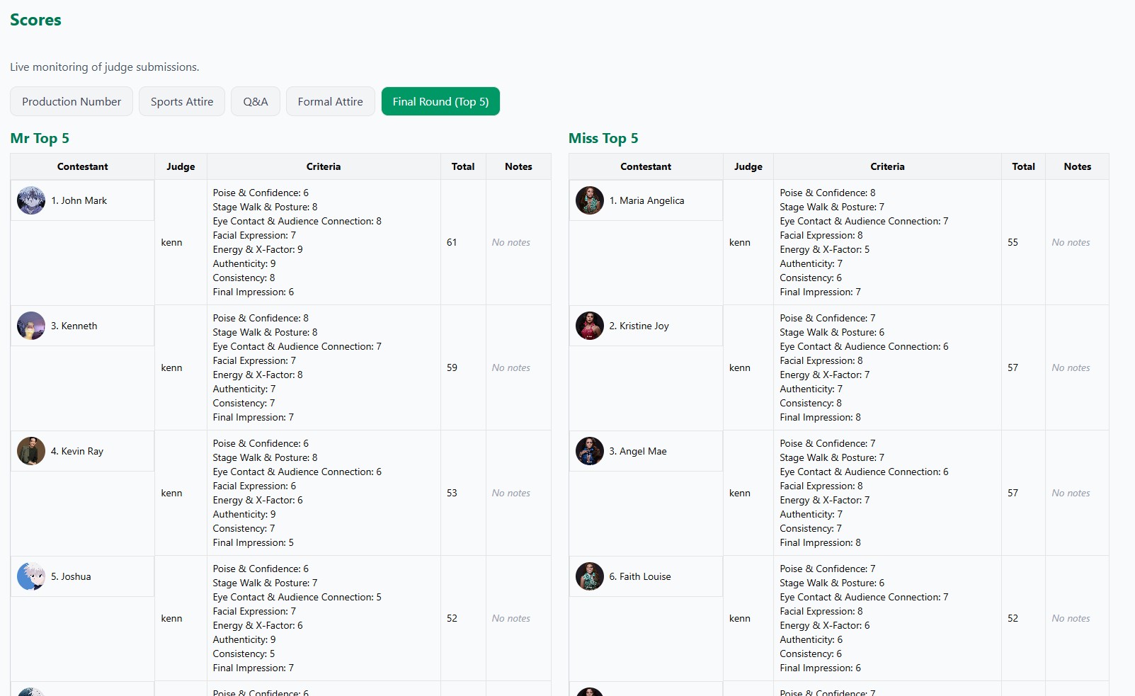 • Top 5 & Finalization — the system auto-ranks contestants after rounds and can mark the Top 5 for the final judging stage.