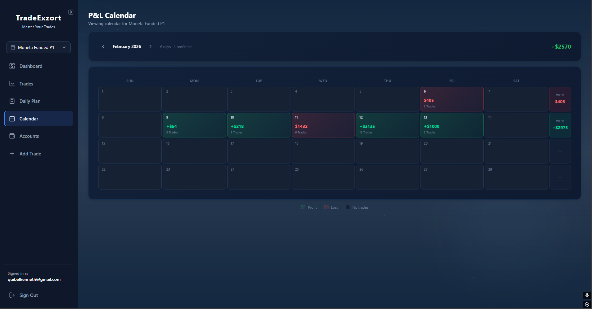 - Daily P&L Heatmap — Instantly identify profitable vs. red days visually