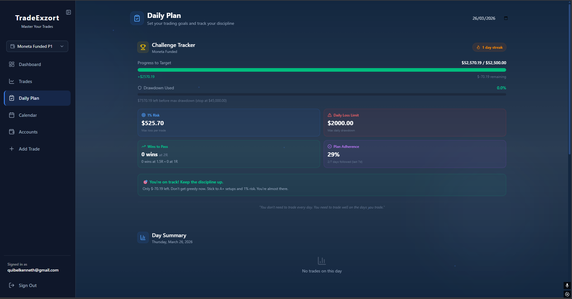 - Sustained Habits — Build better routines by tracking your discipline score alongside your P&L