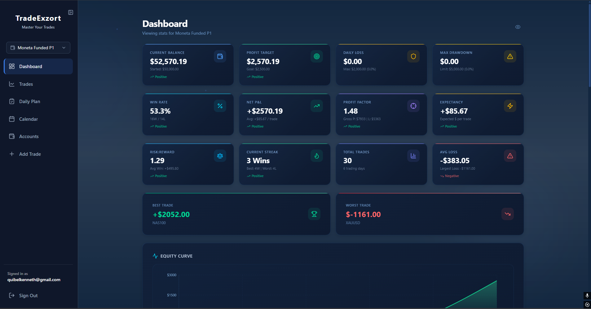 TradeExzort is a modern, feature-rich web application that serves as your personal trading journal. Built with the goal of helping traders master their edge, it provides professional-grade analytics, seamless trade tracking, and account management—all without the burden of monthly subscription fees.